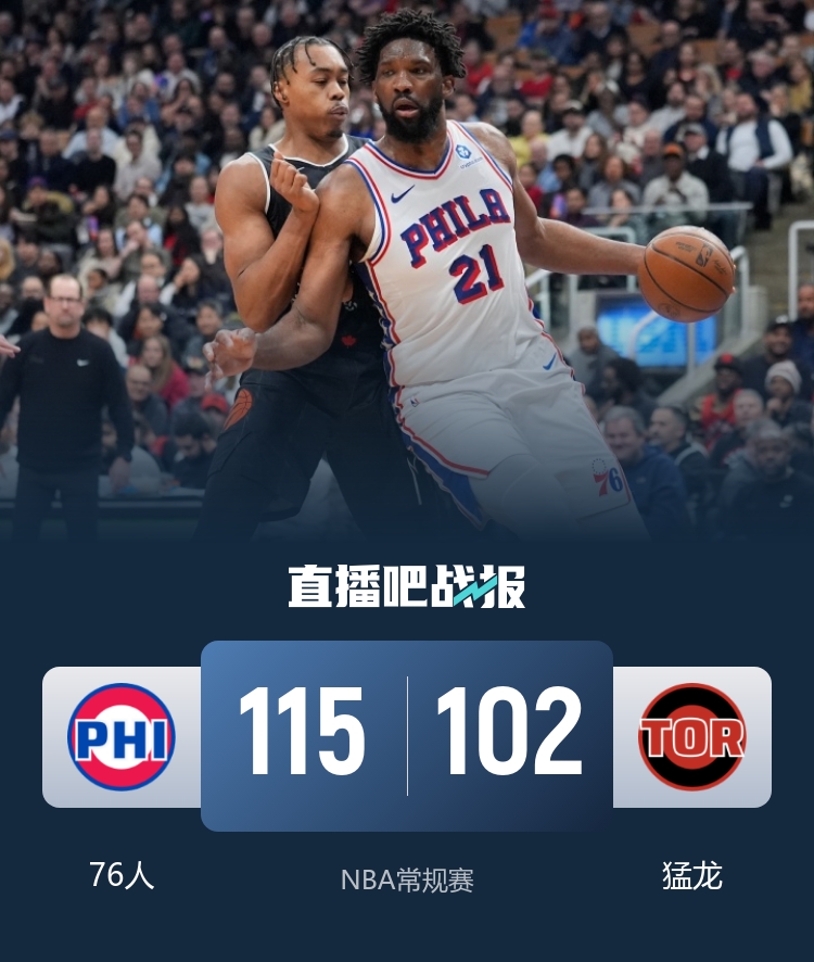 首节对决76人和猛龙拉锯半节时候接管比赛,后半段的轮换时间里76人轰出一波24-9的攻势,他们首节爆砍45分并确立起17分领先;次节76人延续疯狂进攻,他们上半场三分球20投13中可谓弹无虚发,整体命中率高达73%,马克西半场轰下23分的情况下76人带着29分优势进入下半场。休息归来76人手感大幅回落,猛龙虽然在第三节末至第四节初送上一波22-7的攻势但劣势仍然还有17分之多制造不了太大威胁,76人守住大比分领先保持到最后。最终,76人客场击败猛龙完成复仇。