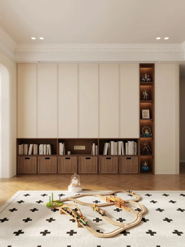 如果家里有孩子的朋友,在装修的时候一定要考虑到玩具的收纳空间,所以这个区域是针对有孩子的家庭。我们可以在孩子的房间,或者家里选择一个空间设计一个小矮柜,做抽拉的设计,平时孩子玩完的玩具,让孩子自己收到柜子里,也能锻炼孩子的独立能力。